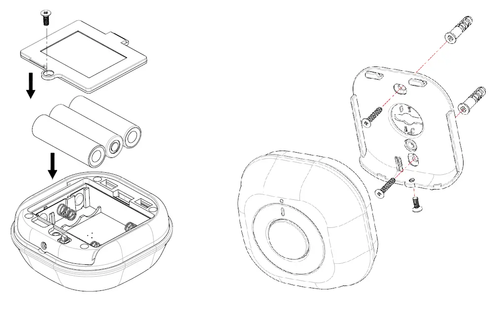The detector can be mounted either on a wall or under a ceiling. There is a dedicated lens cover for the two mounting positions which has to be installed.