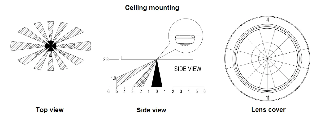 The recommended position for ceiling mounting is at the height of 2.8m from the floor. At this height, the optimum detection range is up to 5m with coverage range of 360 degrees.