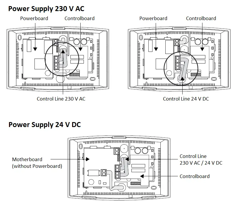 - Connect the cable set as shown in the figure. You can power the device with 230V AC or 24V DC.