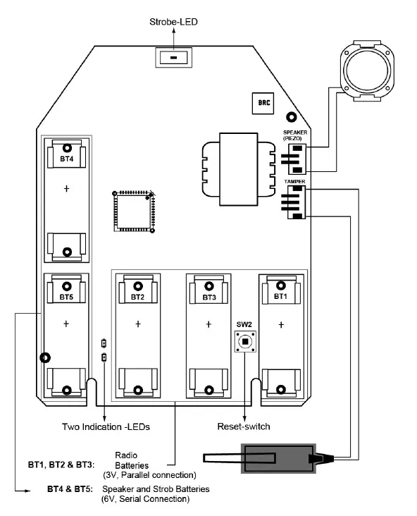 Once placing all batteries in the battery holders or pressing on the reset switch located on the PCB (with the tamper switch open), the sounder performs a functional self test indicated by a strobe flash squawk sound.
