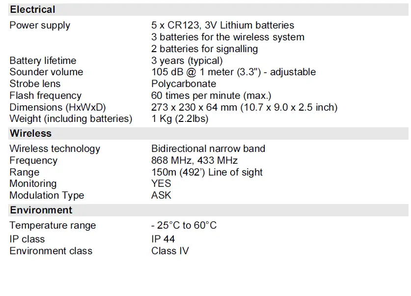 This wireless sounder incorporates a pre-alarm feature that enhances the security of the system by producing a local alarm in case of sabotage.If defined, the system sends a pre-alarm signal to the sounder at the beginning of the entry delay. If the sounder does not receive a cancellation signal from the system at the end of the entry time, the sounder goes into alarm mode.