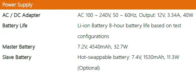 | WWAN (Optional) | LTE via M.2 Slot x 1 Note: Hot-swappable Battery cannot be used when LTE module is installed |