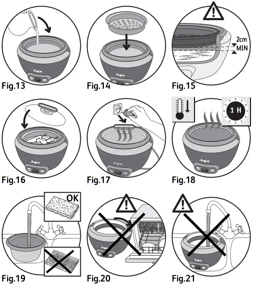 Use hot water, washing-up liquid, and a sponge to clean the bowl – Fig 19, the lid and the steaming basket. Scouring powder and steel wool is not recommended. - If there is food stuck to the bottom of the bowl, leave it to soak before washing.