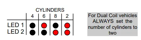 During manufacture, the unit is set to four cylinders. To change this, turn the ignition to the ‘off’ position. Press and hold down the ‘+’ button. Whilst still holding the ‘+’ button, turn the ignition on, but do not start the engine. The two LED indicators situated between these buttons will show the cylinder setting (see table below). Let go of the button.