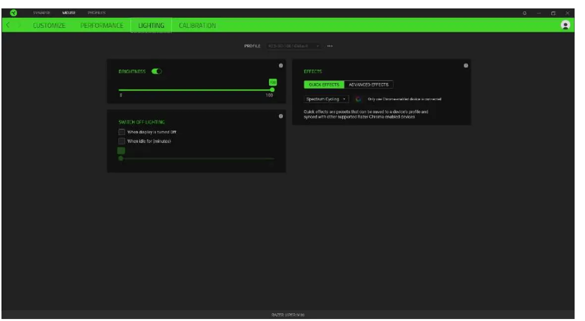 You can turn off your Razer device’s lighting by toggling the Brightness option or increase/decrease the luminance using the slider.