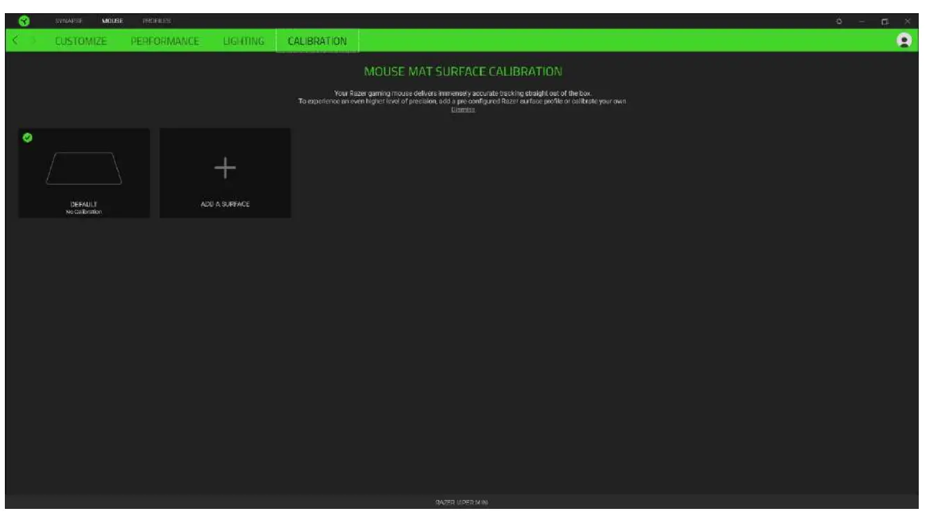 The Calibration subtab allows you to optimize your Razer Precision Sensor to any surface for better tracking. To use this feature, you must click the Add A Surface option where you can select from a comprehensive list of Razer mouse mats or add your own mouse mat.