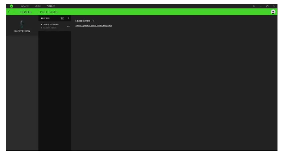 View which Razer device is using a specific profile using the Devices subtab. To create a new profile within the selected device, simply click the add button ( + ). To rename, duplicate, or delete a profile, simply press the Miscellaneous button { ••• ). Each profile can be set to automatically activate when you run an application using the Link Games option.
