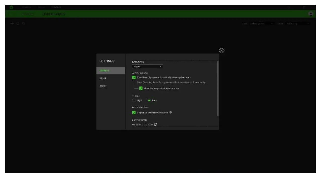 ) button on Razer Synapse 3, enables you to configure the startup behavior, change language, view your Razer device’s master guide, or perform factory reset on any connected Razer device.