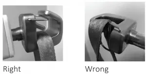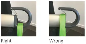 - It is important to always check that the loops are at the bottom of all hooks (see picture below), securely placed below the locking pin.