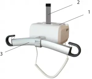 Set the telescopic bar (4) to the prescribed position. Ensure that the bar hooks are in the same position on both sides. Place the patient in the prescribed sling according to the sling instructions and hang the sling in the hooks on the telescopic bar and in the leg hook, if you are using three-point suspension (5). Check that the sling’s lifting straps are properly anchored in all hooks.