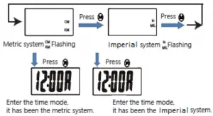 British System (70 LB to 250 LB,10 Inch to 80 Inch) - To shift between the metric and British system, just press and hold for 6 seconds under any mode.