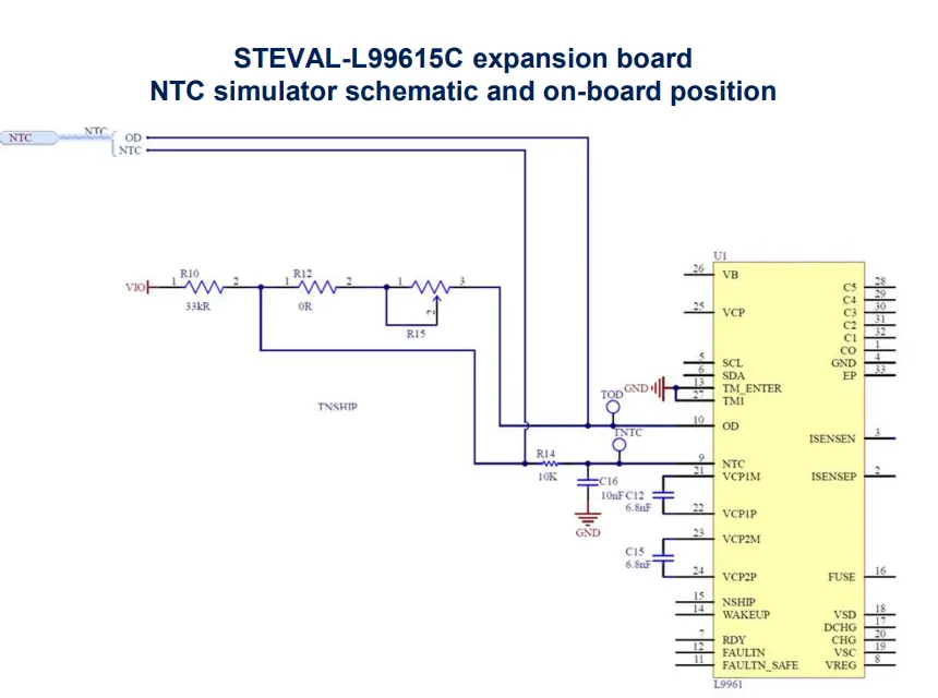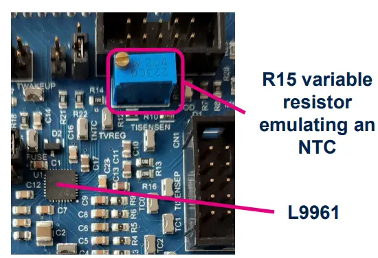 - For demonstrating how the L9961 measures the temperature of a battery pack via NTC, the STEVAL-L99615C embeds a variable resistor (referred to the internal LDO voltage).