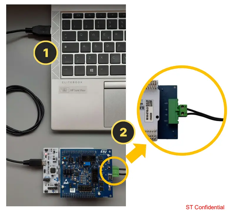 - Connect the STEVAL-L99615C kit to the laptop using the USB Type-A to Micro-B cable.