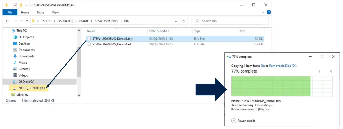 - Drag and drop the binary file of the STSW-L9961BMS application firmware(* ) , from the origin folder to the NUCLEO that has been mapped by the laptop OS as an external peripheral.
