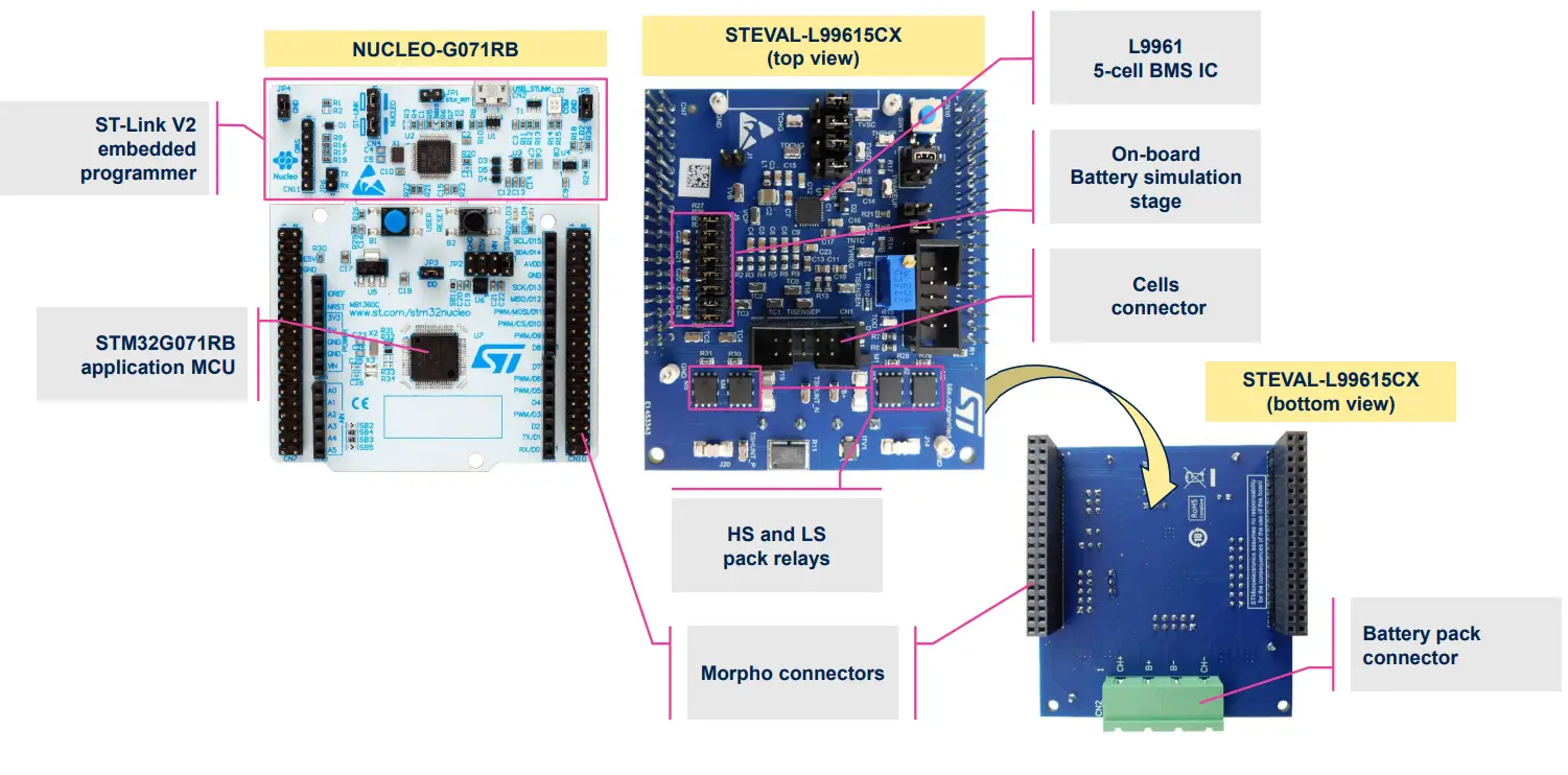 - Kit composition: • STEVAL-L99615C: NUCLEO-G071RB development board with STM32G071RB MCU + STEVAL-L99615CX expansion board integrating the L9961 5-cell BMS IC