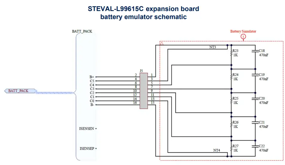 - hanks to its design, the STEVAL-L99615C permits to simulate a 5-cell battery pack simply applying a voltage, by an external power supply, to the CN2 connector.