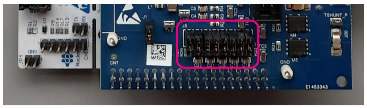 Note: It is assumed that 5-battery pack cell battery board is not used.J6B EXP. BOARD Used to drive NSHIP pin from micro Closed J15, J16, J17, J18 EXP. BOARD Used to configure the relay MOSFETs to ei1her high or low-side usage 1-2: HS configuration is selected J13, J14 EXP. BOARD Used to bypass the HS relay MOSF Closed J19, J20 EXP. BOARD Used to bypass the LS relay MOSFETs Closed JP3 NUCLEO STM32 VDD current measurement Open JP2 NUCLEO STM32 5 V jumper selection 1-2: 5 V from STUNK CN4 NUCLEO STM32 SWD interface Closed