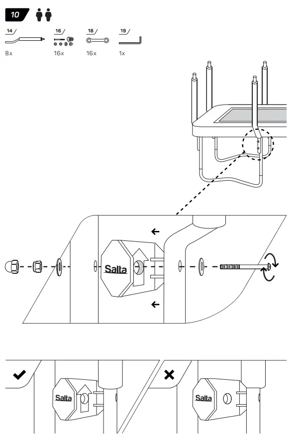 In severe wind situations, the trampoline can be blown away. To increase security we recommend to use the official Salta Anchor set. If you expect windy weather conditions, the trampoline should be moved to a sheltered area or disassembled.