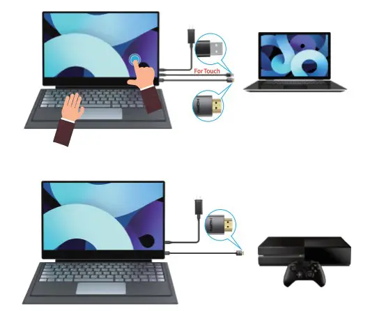 - You have to use an USB A-C cable to connect for KEYBOARD & TOUCH function while you connect the lapdockto devices via mini HDMI port.