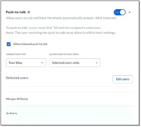 Allow users to call specific users and have the phone automatically answer, similar to an intercom. Users with push-to-talk enabled can call and immediately speak to other users who also have it enabled. |