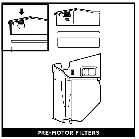 With the dust cup detached, press the Filter Access buttons on both sides of the back of the dust cup, then pull out the filter housing. Pull the foam filter out of the housing, then lift out the felt filter by the pull tab. The Pre-Motor Filters should be washed once a month.