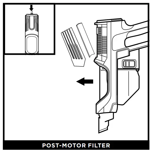 To access the post-motor filter, press the release latch on the filter cover on the handheld vacuum. Remove the cover and lift out the filter. The Post-Motor Filter should be washed once every 9 months.