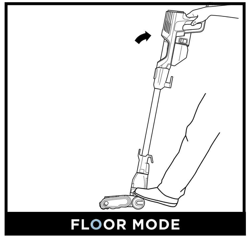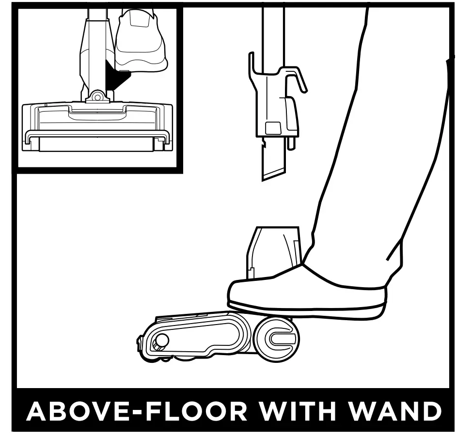 To clean floors, step on floor nozzle and tilt handheld vacuum back.
