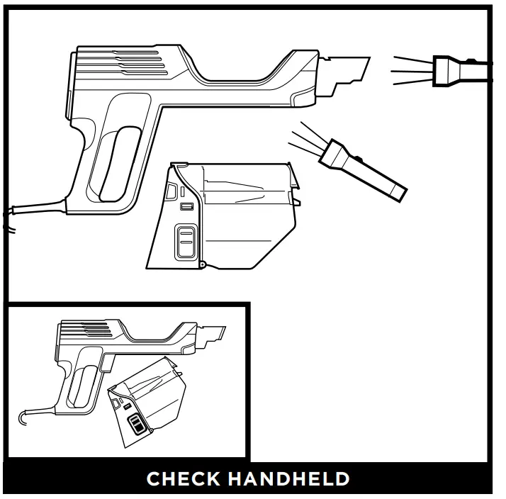 - Clear any blockages in the nozzle, wand, handheld vacuum, or accessories. See Checking for Blockages section for more information.