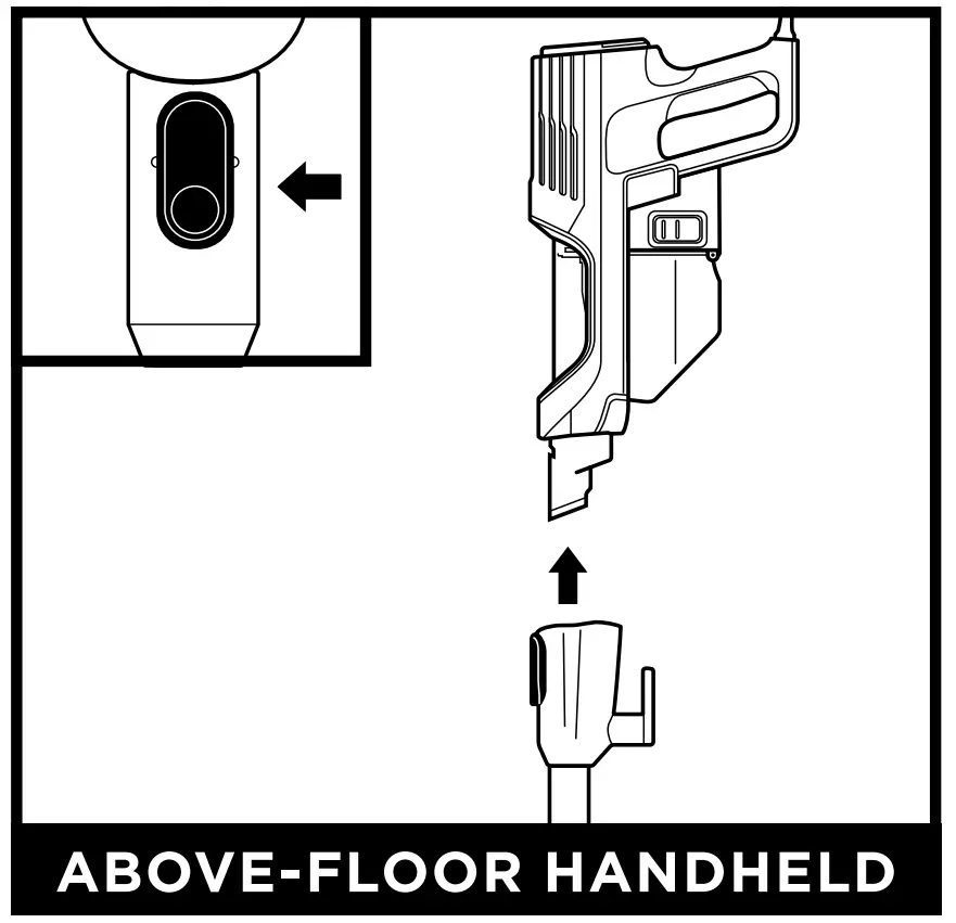 Press the Wand Release button near the top of the wand to detach the handheld vacuum.Align the Catch on the side of the handheld vacuum with the Storage Hook on the wand, then hang the handheld vacuum from the hook