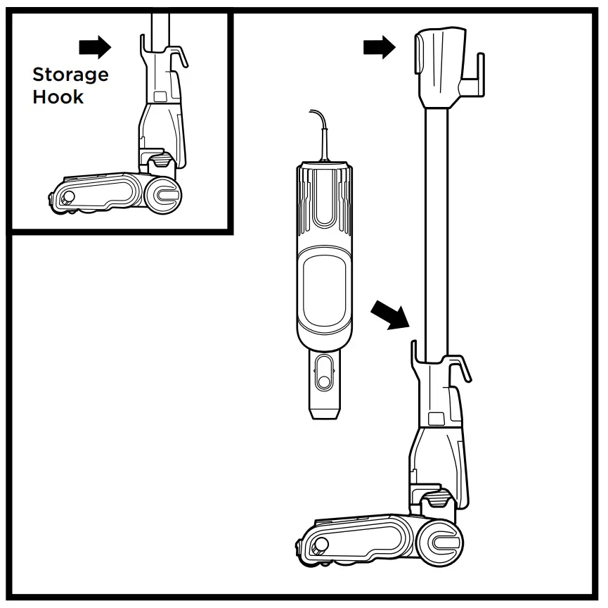 - For compact storage, hang the handheld vacuum from the Storage Hook on the wand.