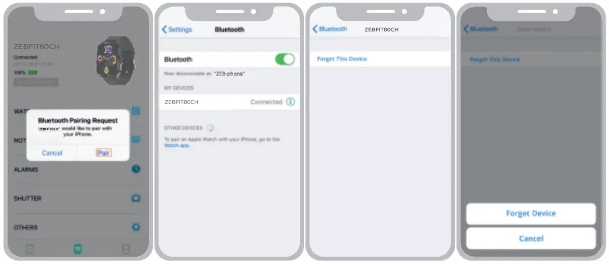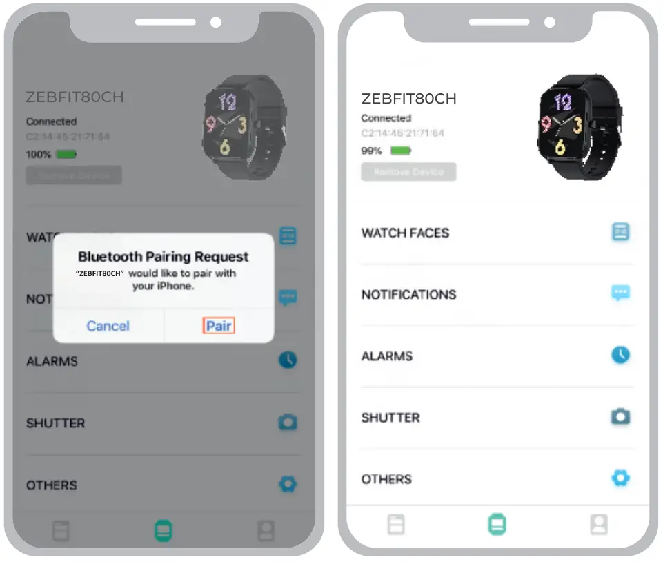 • Select the device name ZEBFITSOCH from the scanned name list. While pairing, iOS devices display a BT pairing request which must be given ‘Pair’ to confirm and proceed.