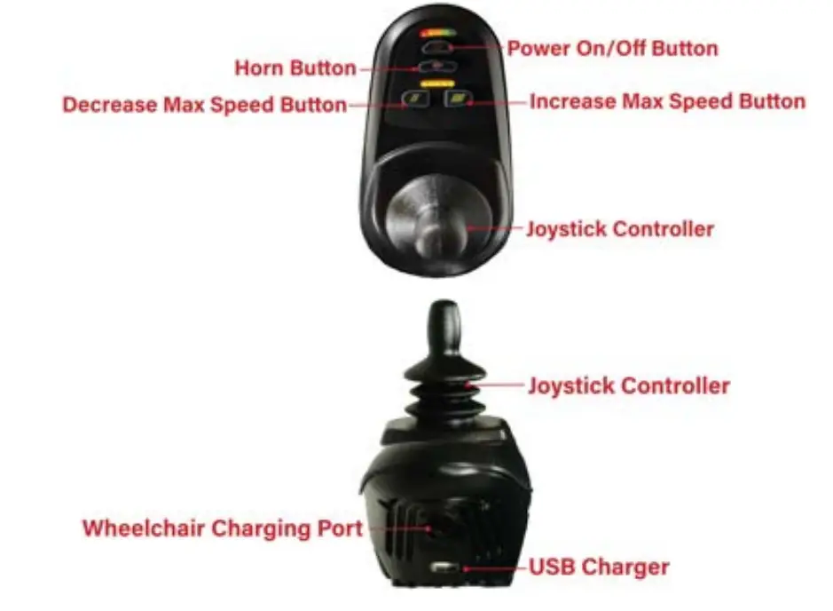 The joystick console houses all controls needed to drive your electric wheelchair, including the on/off button, joystick control lever, horn button, speed adjustment buttons, battery level indicator, USB charging port, and troubleshooting LED indicator.