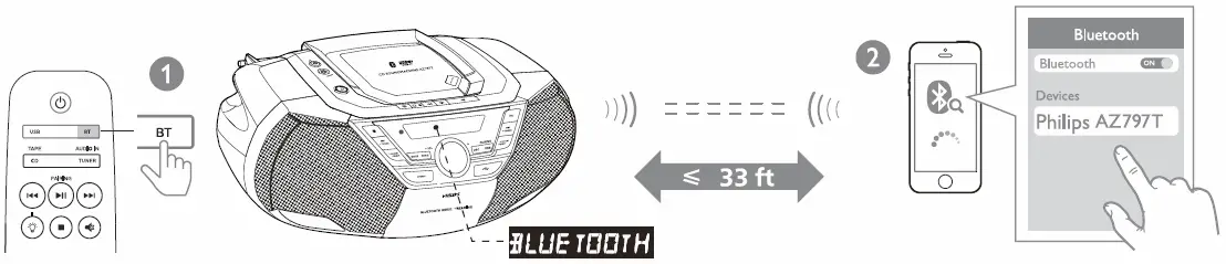 - If you cannot find [Philips AZ797 T) on your device, press PAIRING for 2 seconds to enter pairing mode, [PAIRING) (pairing) is displayed on the screen.