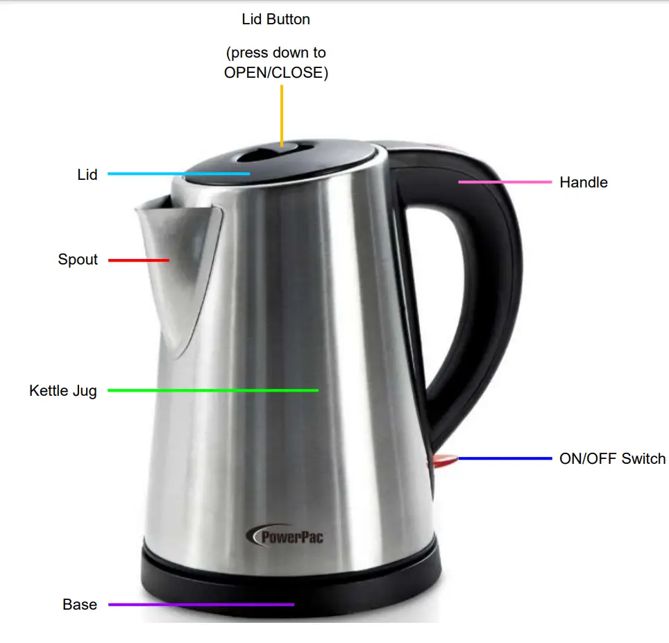 - Only use original components & accessories provided by the manufacturer. Any non-original component or accessory NOT recommended by the manufacturer may cause injuries to persons or damage to the appliance. DO NOT use other Bases or Kettle Jugs belonging to other models from the same manufacturer or other manufacturers. Doing so will void the warranty and may cause serious injury