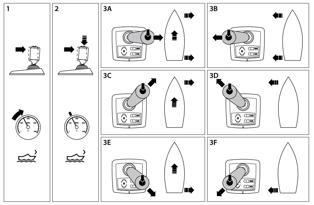 When the ‘DOCK’ LED stops flashing and remains on the system is in Docking Mode. Both propulsion engine, bow and stern thruster can be controlled by the joystick.