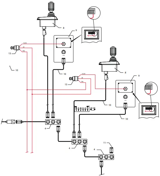 Consult the diagrams on page 90 – 93 how to interconnect all the components of the system to the CAN bus hubs.