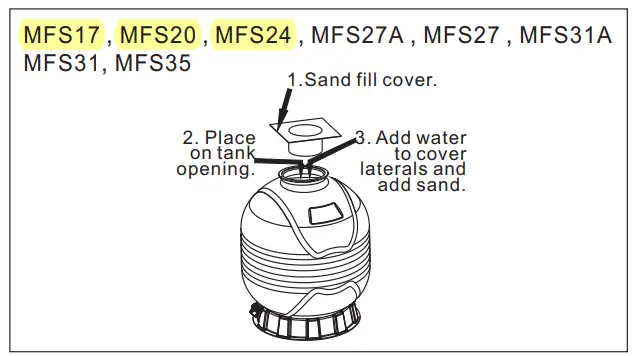 1/ Be sure the correct amount of filter sand media is in the tank and all connections have been made and are secure.