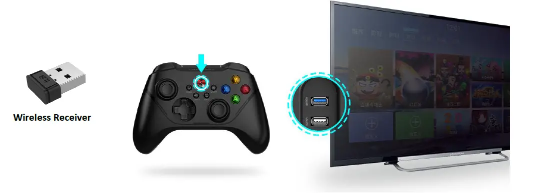 Insert the wireless receiver into the USB interface of the TV, and press the BEITONG Logo (HOME Button) to turn Controller on. The connection is completed when the Controller vibrates and the breathing light is on.