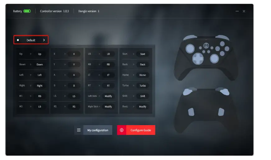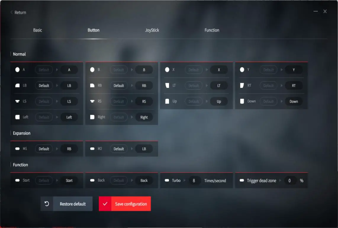 - Click the “Default” button of any button of LB/RB, M1/M2 in the “Button” tab enter into the next interface.