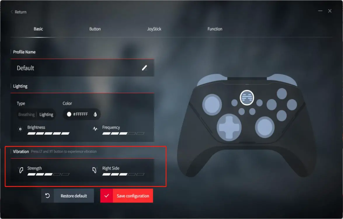 - Drag the “Vibration” slider in the “Basic” tab interface to adjust the vibration intensity. The vibration motors on the left and right sides each have five gears that can be adjusted.