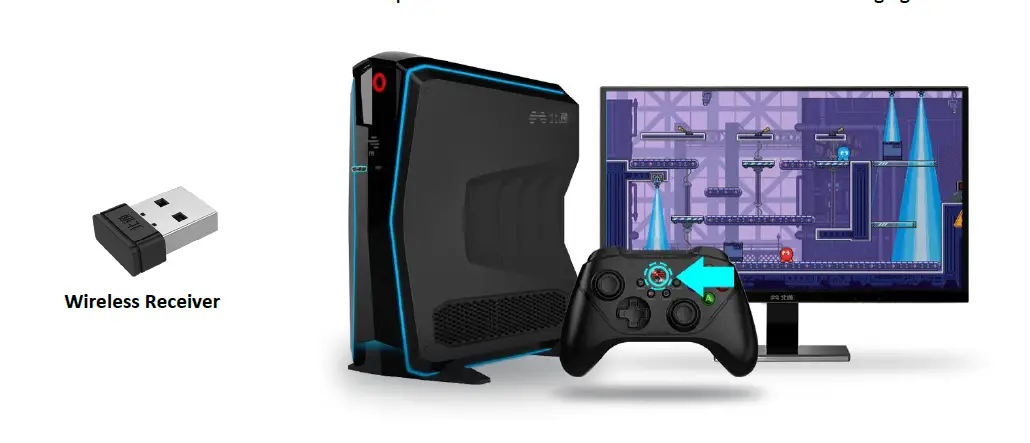 Insert the wireless receiver into the USB interface of the computer, and press the BEITONG Logo (HOME Button) to turn Controller on. The connection is completed when the Controller vibrates and the breathing light is on.
