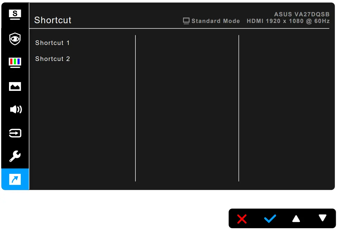 When a certain function is selected or activated, your shortcut key may not support. Available function choices for shortcut: Blue Light Filter, Splendid, Brightness, Auto Adjust, Contrast, Color Temp., Volume, GamePlus, Quickfit, Rest Reminder, Color Augmentation