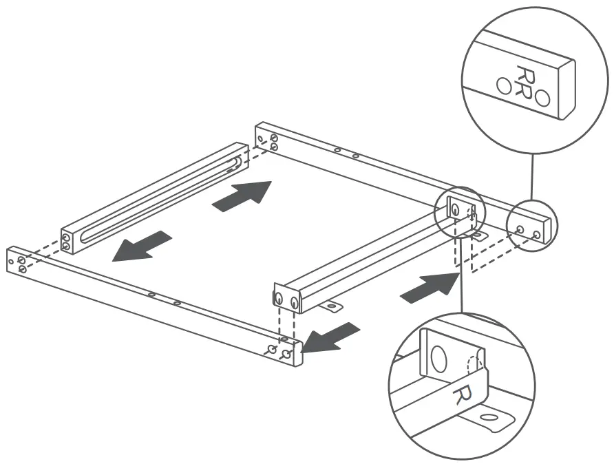 - Loosen the screws of Left Front Leg assembly (A25) and Left Rear Leg assembly (A24), turn the side with “L” on Left Top Cart Frame Assembly (A21)to side with “LR” onLeftRear Leg assembly (A24), and then tighten the screws. Install Left Bottom Cart Frame Assembly (A23) to Left Front Leg assembly (A25) and Left Rear Leg assembly (A24).