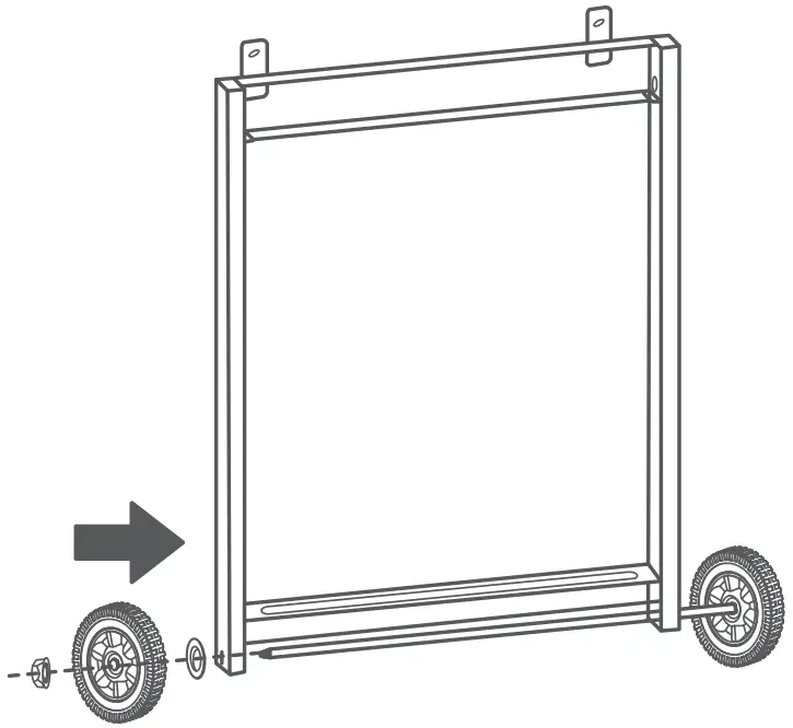 - Install the Caster (A12), Flat Washer (A15), Hexagon flange lock nut (A23) and Axle (A17) on the right frame.