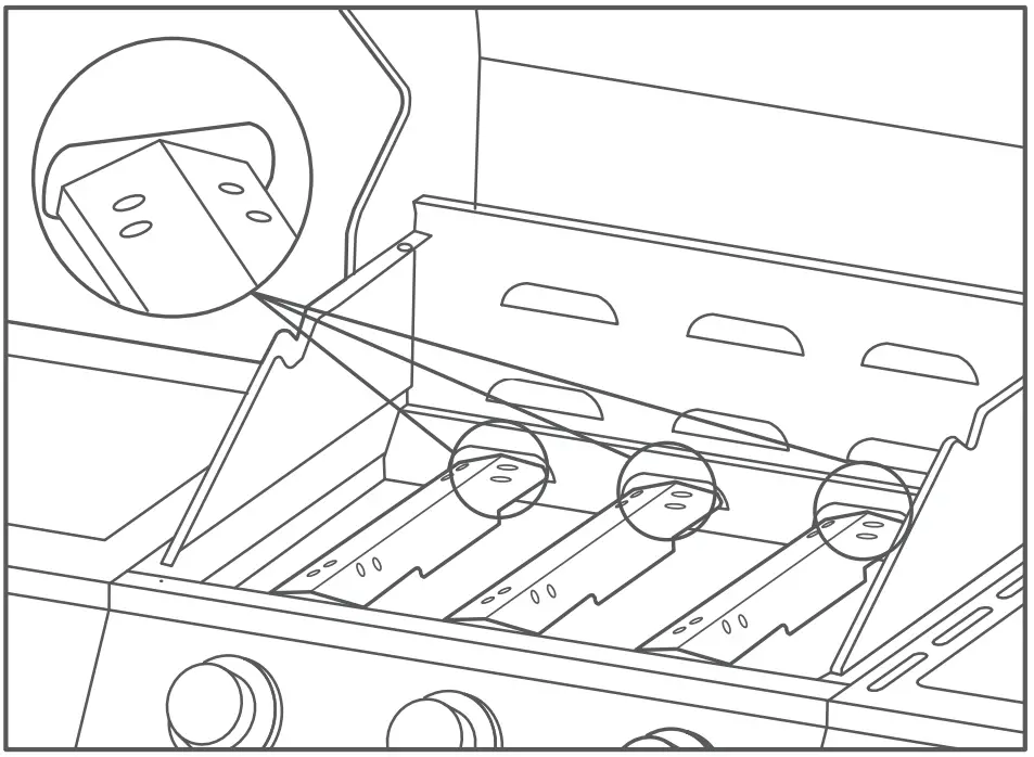 Note: Follow the “Gas Leak Testing” section of this manual. Relight burners to verify proper operation. - Replace heat distribution plates and cooking grills.