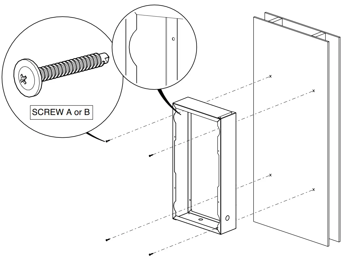 Locate the four holes on the surface mount and fasten to the wall with the appropriate screws based on the stud type. Screw A can be used for wood studs and Screw B can be used for metal studs.