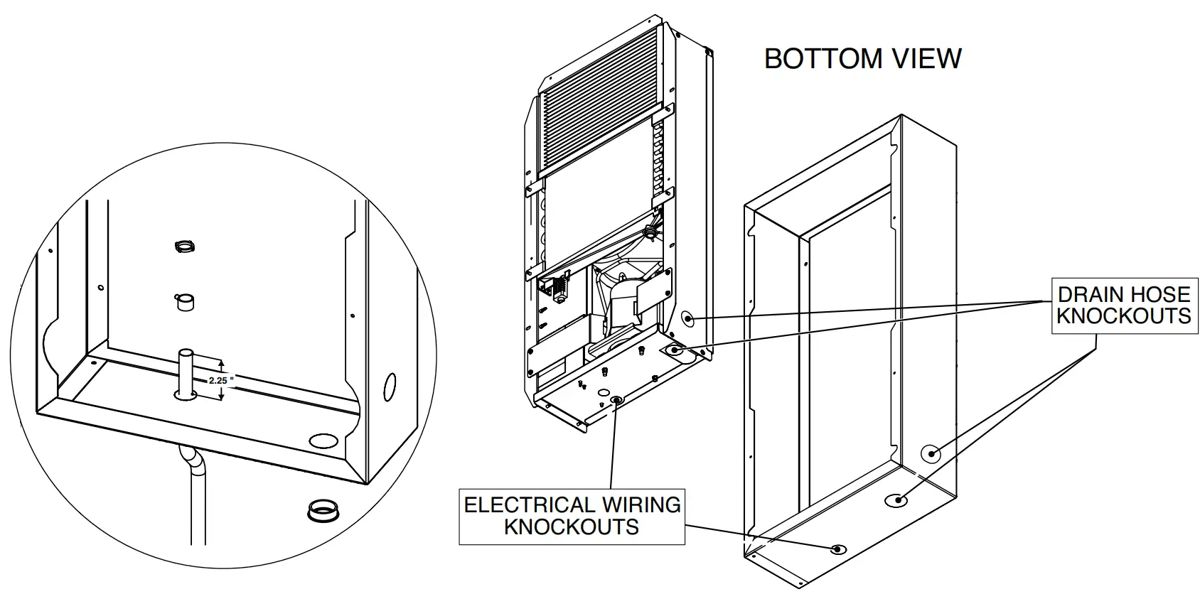 Lift and support the dehumidifier by the plastic drain pan below the evaporator coil and place inside of the surface mount. Two people are recommended for this step.