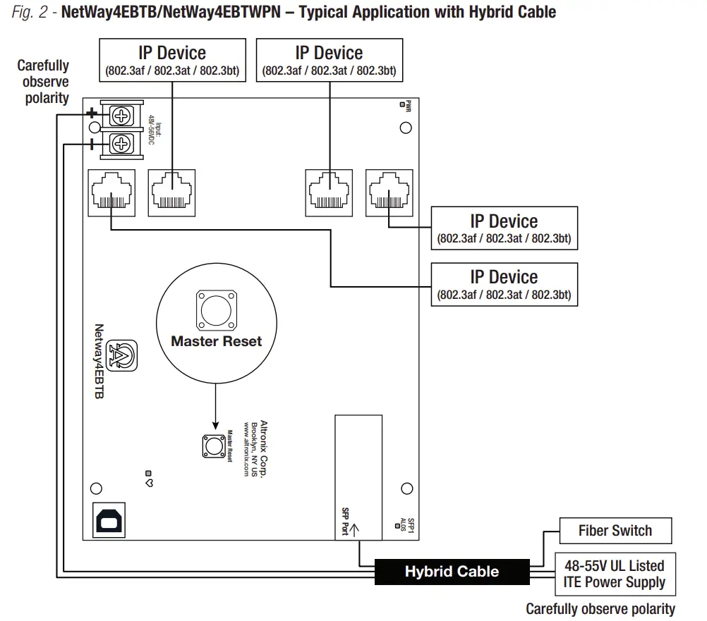 - NetWay4EBTB: Connect 56VDC/280W max power source to terminal marked [+] and []. SFP1 ALOS SFP Port Master Reset