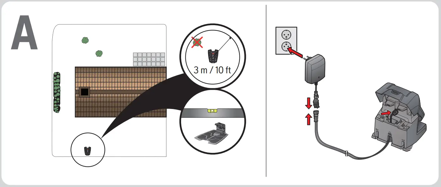 - Place the charging station at a central position in the working area, with a lot of open space in front of the charging station and on a relatively horizontal surface.