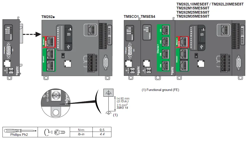 - Clip-on lock for 35 mm (1.38 in.) top hat section rail (DIN rail) 6 – Functional ground screw